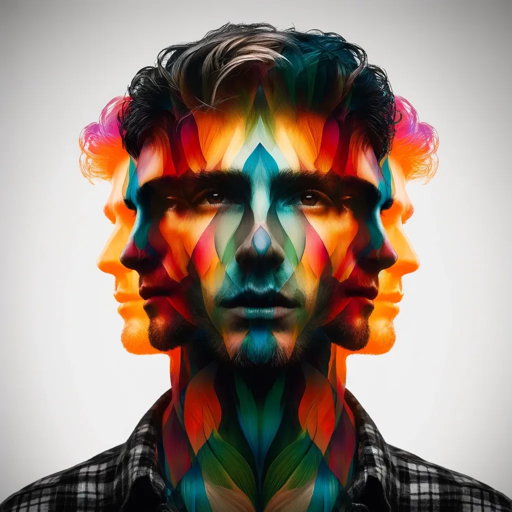 - Prismatic self: Multi-exposure, monochrome palette grid. 50mm, f/5.6, 1/125s, ISO 400. --ar 16:9