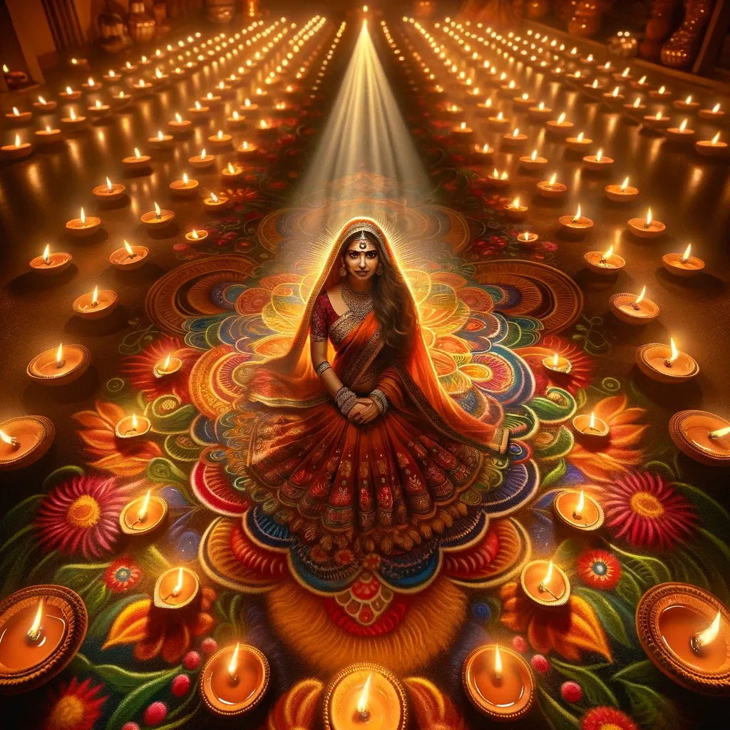 - Diwali Diya Dreamscape: Rangoli with diyas, woman in saree. Fujifilm GFX 100S, 32-64mm, 1/60s, f/8, ISO 800. Shallow DoF. --ar 16:9