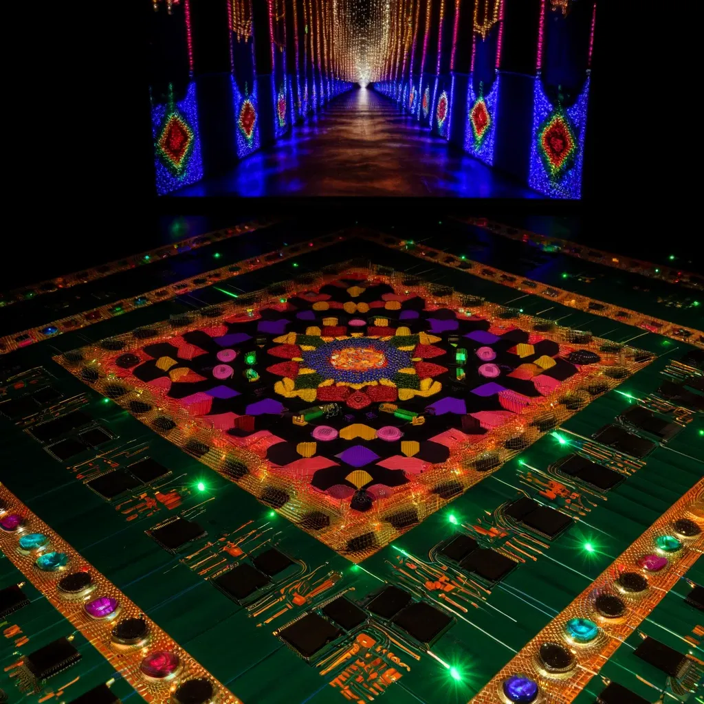 - Cosmic Rangoli Tech: Circuit boards, microchips, colorful wires in rangoli. LED lights flicker. Sony A7R IV, 24mm tilt-shift, f/11, 8s, ISO 100. Infinite depth. --ar 16:9