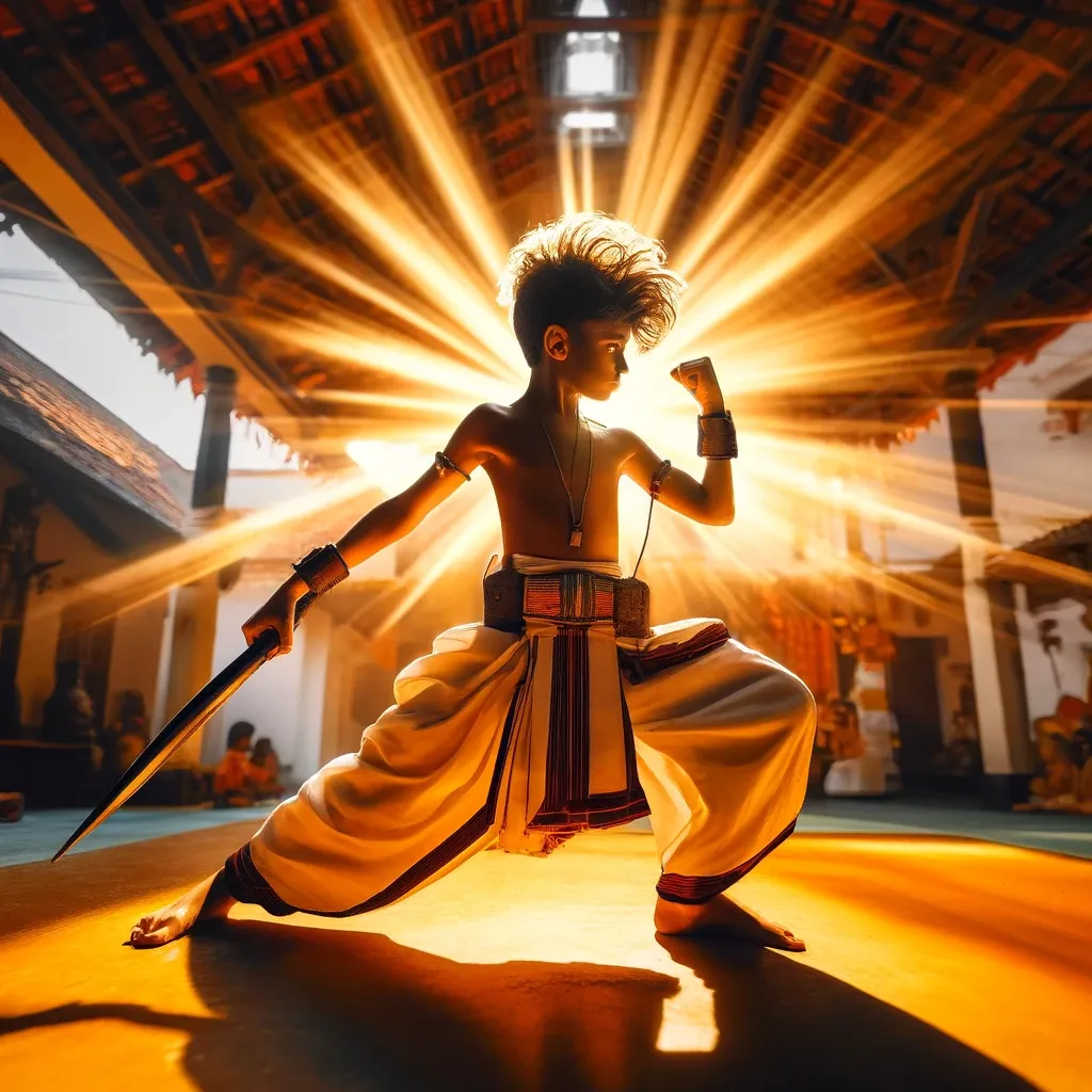 - Kalaripayattu Warrior: Young student in fierce pose, ancient martial art aura. Canon EOS R3, 14-35mm at 35mm, f/8, ISO 100. Kodachrome-like colors.