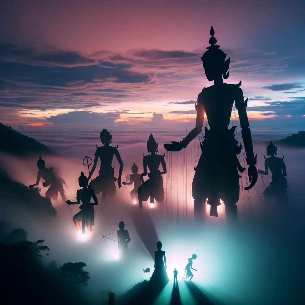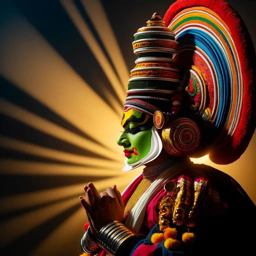 - Kathakali Shadows: Silhouette Kathakali dancers against vibrant backdrop. Side-lit for striking profiles. Sony A7R IV, 135mm f/1.8, f/2.8, 1/250s, ISO 800. Shallow DoF. --ar 16:9