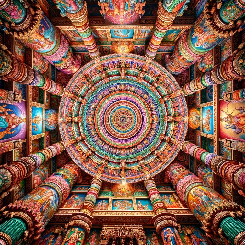 - Madurai Ceiling: Meenakshi Temple's colorful mandalas. Sony A7R IV, 12-24mm, f/5.6, 1/60s, ISO 1600. Tripod, soft light. --ar 16:9