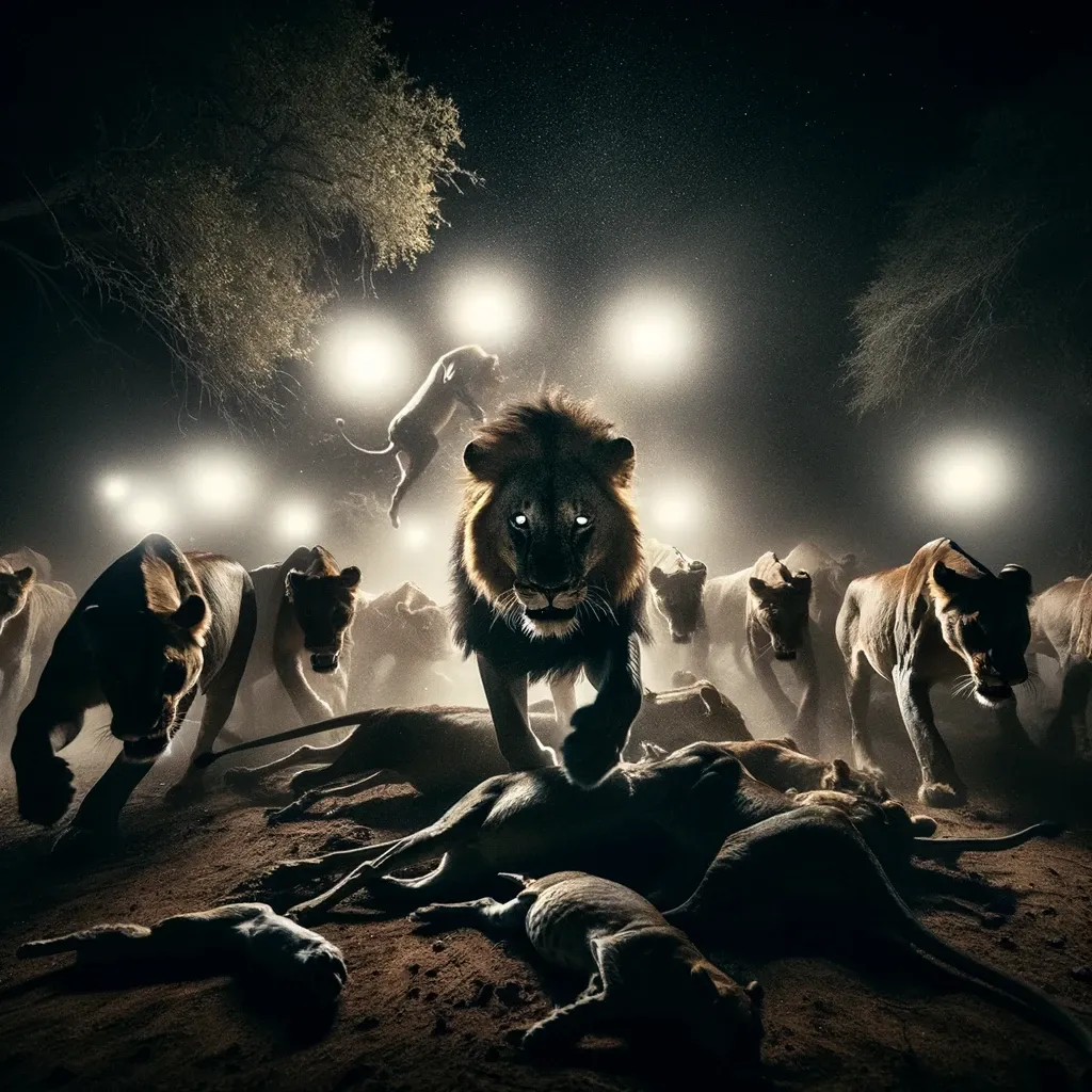 - Night Pride Hunt: Lions, camera trap, off-camera flash. Telephoto (400mm), f/4, 1/1000s, ISO 1600. Isolate action. --ar 16:9