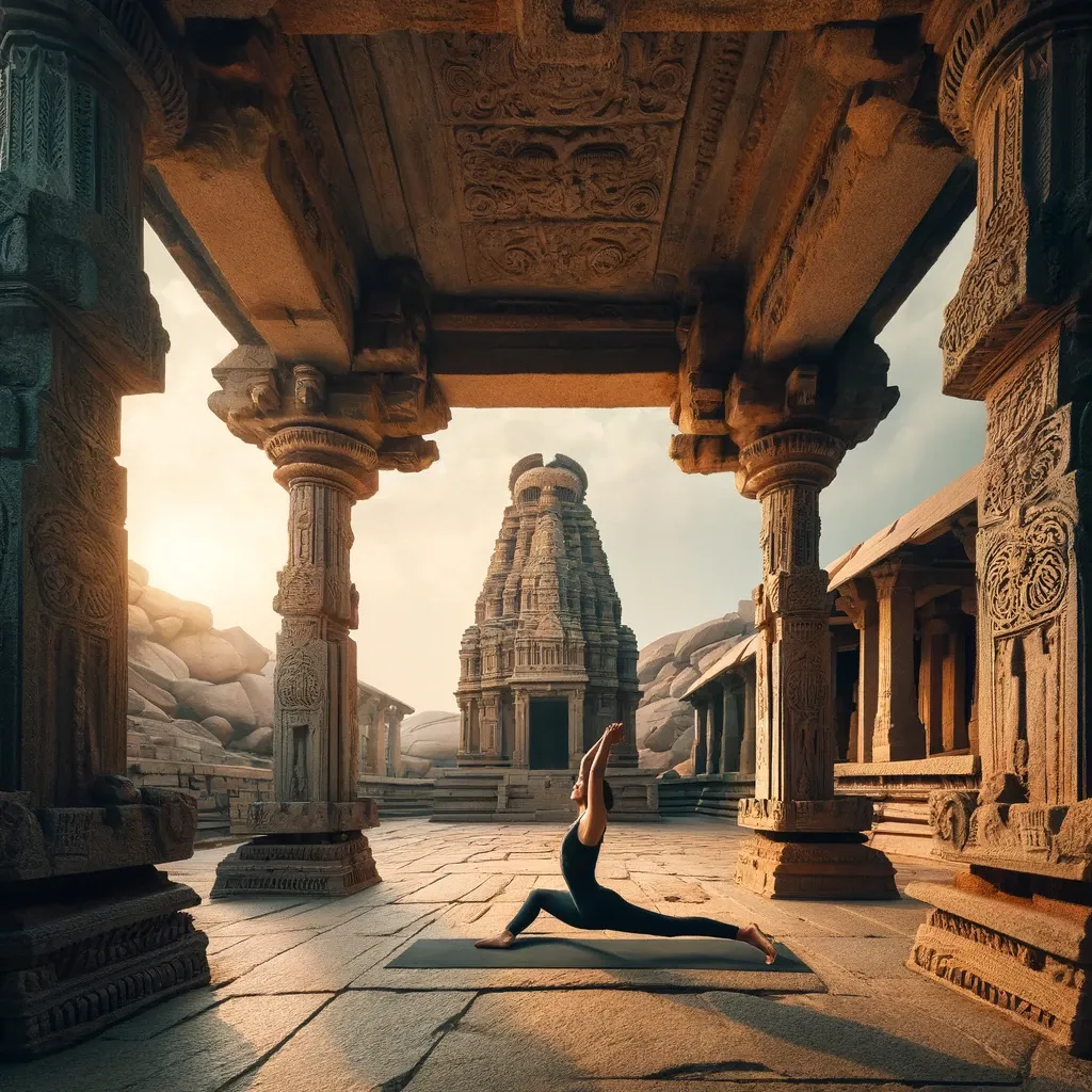 - Yoga in Ruins: Yogi in asana amid Hampi ruins. Dawn shot. Sony A7R IV, 16-35mm, f/11, 1/200s, ISO 400. Polarizing filter. --ar 16:9