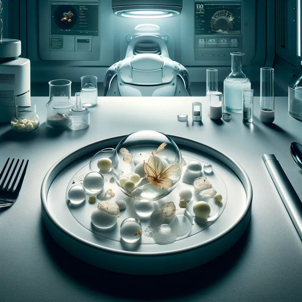 - Space gastronomy: Floating spheres, gels, foams. Stark clinic light. Hasselblad X1D II, 120mm macro, f/11, 1/60s, ISO 100. Texture focus. --ar 16:9